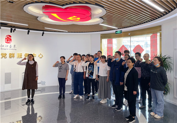 在太仓中国共产党纪律建设历程展示馆,支部书记王承茜带领全体党员高举右手,面对鲜红的党旗,重温入党誓词。