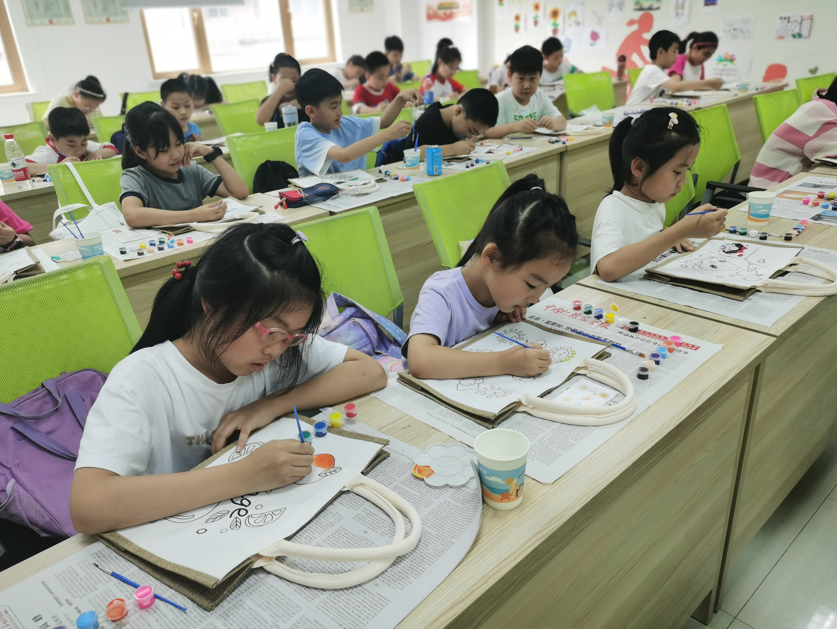 活动现场,志愿者老师拿出事先制作好的环保手袋打了个样,讲解了如何在帆布包上勾线、上色等一些技巧和注意事项,建议小朋友们可以按照参考样式填色,也可以发挥大胆想象。工具发放完毕,小朋友们便迫不及待地开始创作了。小朋友们用画笔蘸上颜料,或细细勾勒,或大块填涂,三三两两凑做一堆,交流着创作想法。志愿者老师穿插介绍着三原色,颜色的调和配比。在志愿者老师的辅导下,小朋友们用五彩缤纷的画笔,稚嫩却用心的笔触,在帆布包上填涂绚丽的色彩,一个个原本空白无趣的帆布包,经过孩子们精心绘制,一幅幅亮丽的画面跃然包上,让原本素净的帆布包变得灵动起来。小小的帆布包,看似普普通通,如果自己动手绘制,凭借创意和想象,画上自己喜欢的图案,普通帆布包就变成一件件精美的工艺品。拿着自己亲手绘制的帆布包,孩子们的脸上也绽放出开心的笑容。